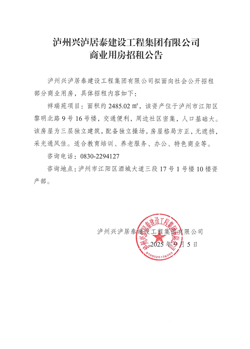 泸州兴泸居泰建设工程集团有限公司商业用房招租公告