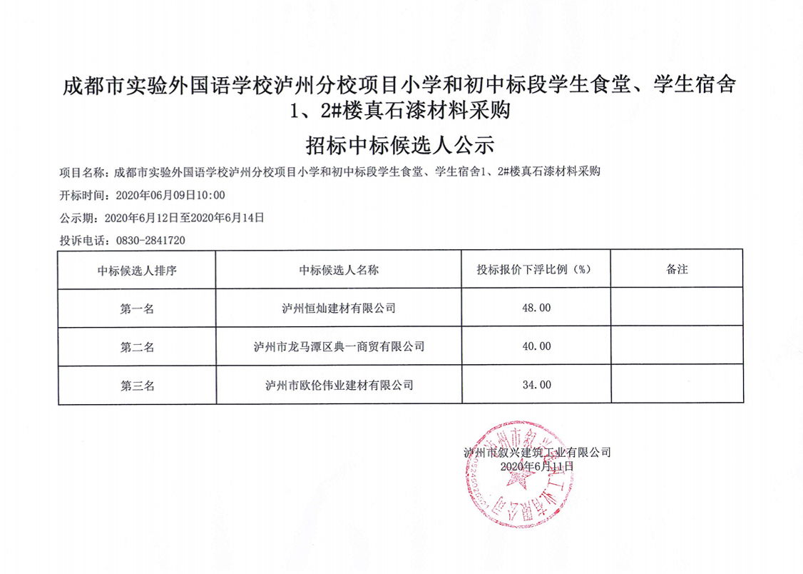 成都市实验外国语学校泸州分校项目小学和初中标段学生食堂、学生宿舍1、2#楼真石漆材料采购中标候选人公示