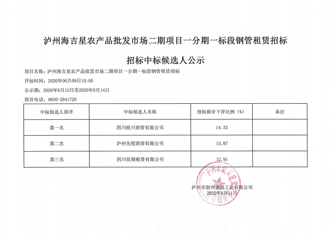 泸州海吉星农产品批发市场二期项目一分期一标段钢管租赁招标中标候选人公示