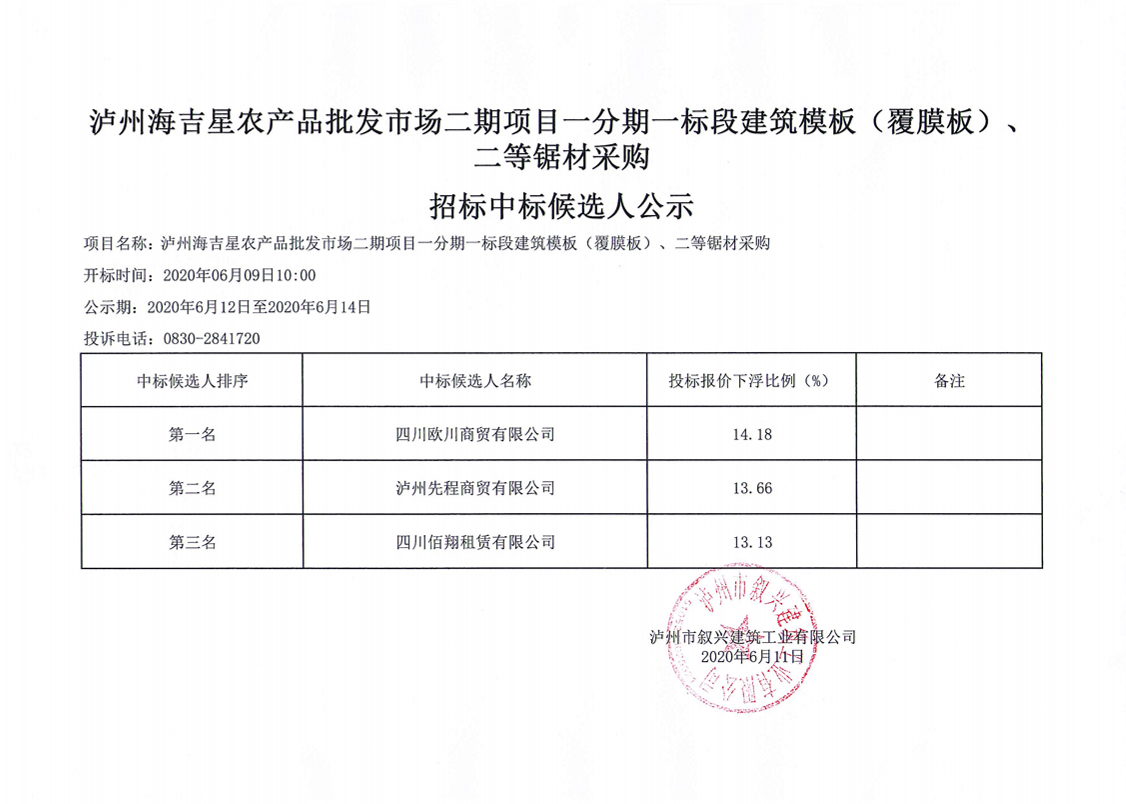 泸州海吉星农产品批发市场二期项目一分期一标段建筑模板(覆膜板)、二等锯材采购中标候选人公示