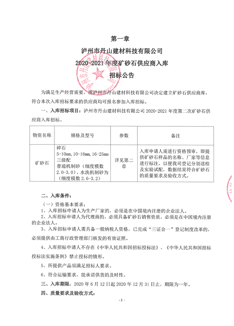 泸州市丹山建材科技有限公司2020-2021年度矿砂石供应商入库招标公告